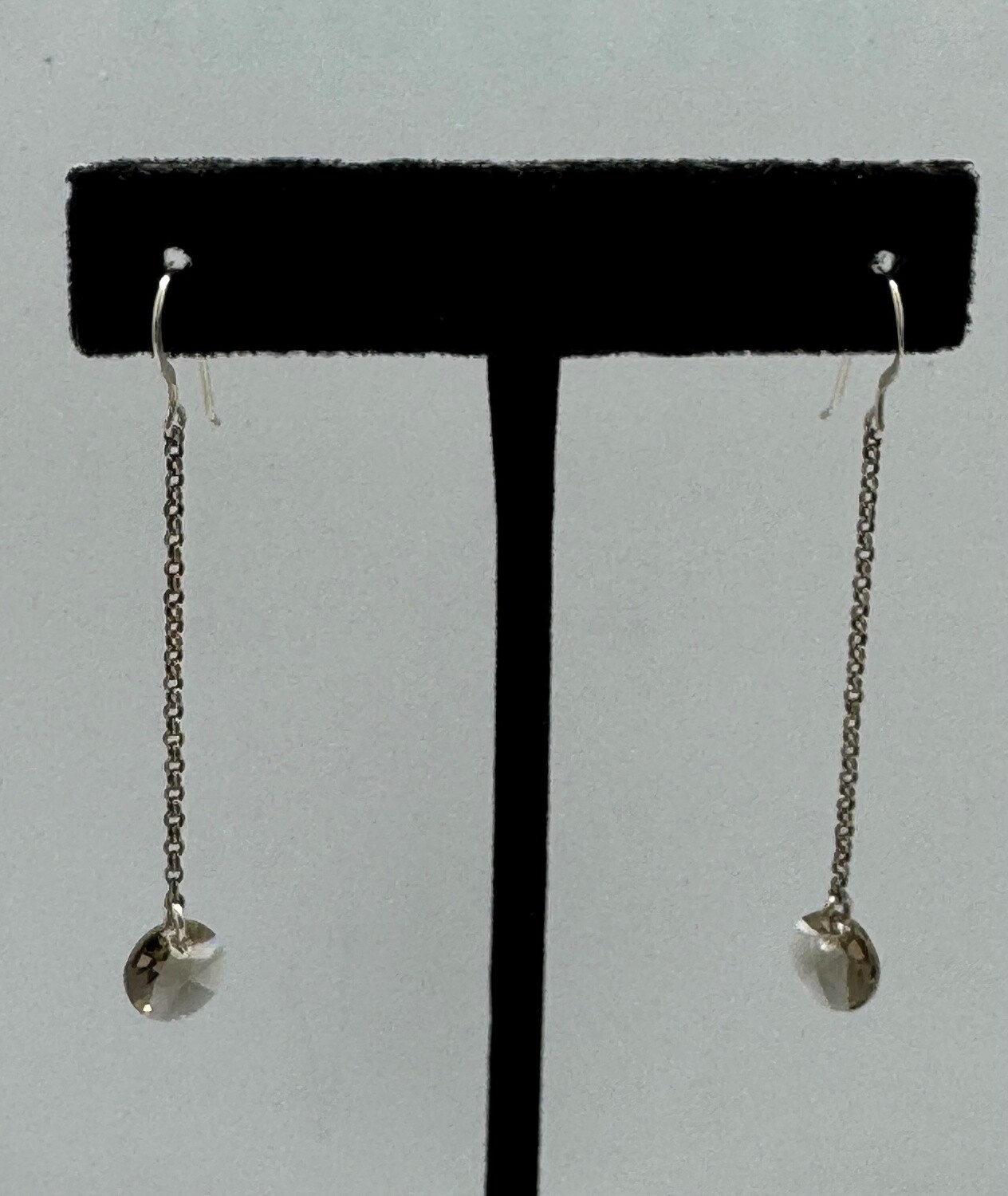 These dangle earrings exude an understated elegance, featuring a captivating Greige Xilion crystal suspended delicately from an antique silver-plated chain. Each earring is a blend of vintage charm and contemporary sophistication, designed to add a touch of refinement to any ensemble.
