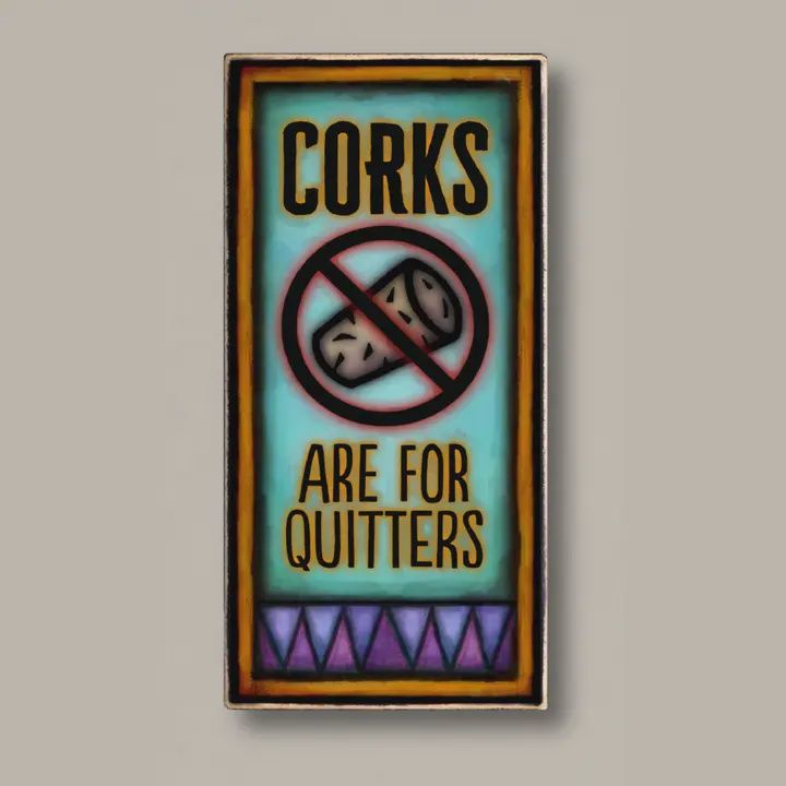 Wood art by Michael Macone with the quote, "Corks are for quitters" Printed with archival ink on archival paper, attached to wood and UV coated to last a lifetime. Can hang or stand with included peg.