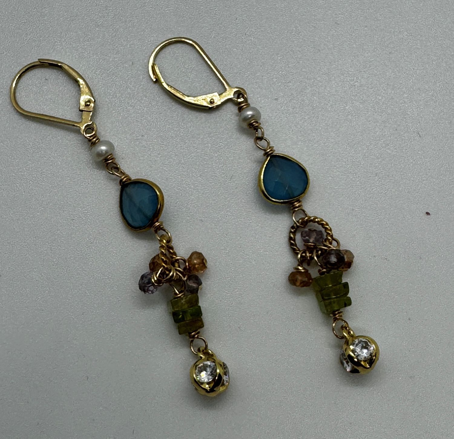 The beautiful bright mix of gemstones set with gold-filled chain and lever backs, features a freshwater pearl, blue chalcedony, peridot, quartz, and a brilliant cubic zirconia for a little extra sparkle.