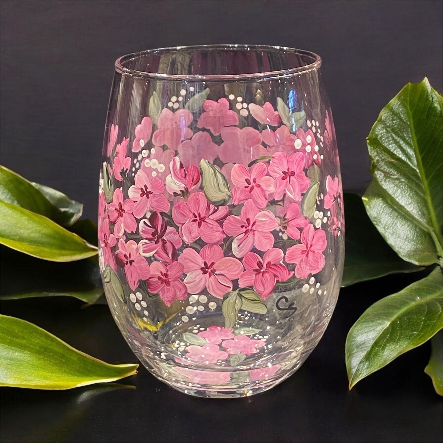 The base of the glass features three small cherry blossoms, adding a touch of elegance and refinement. This stemless wine glass is a perfect blend of functionality and artistry, ideal for sipping a favorite vintage while enjoying the serene beauty of cherry blossoms in every sip.
