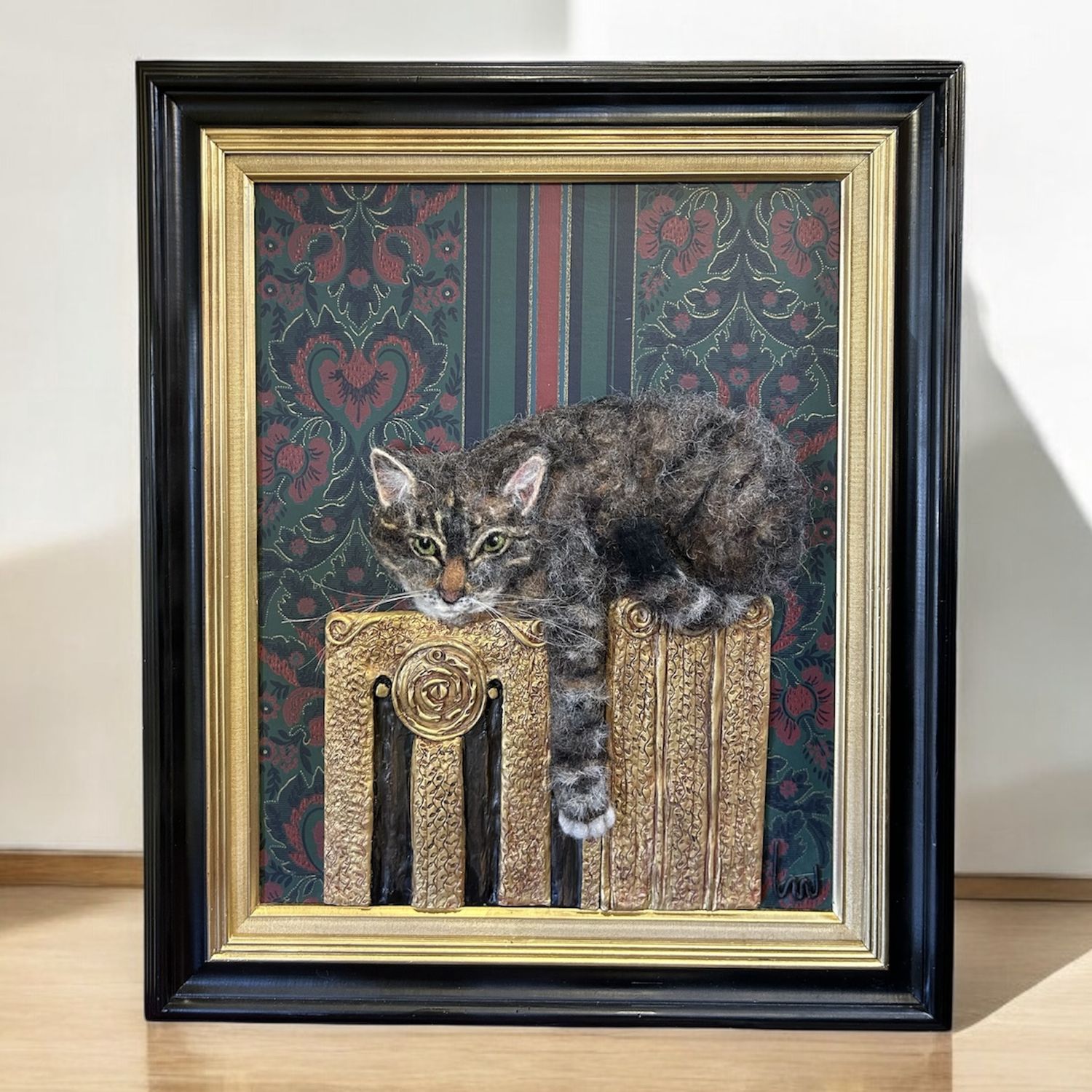 This unique original artwork features a meticulously needle-felted cat lounging atop a handcrafted polymer clay radiator, creating a stunning three-dimensional effect. Set against a richly patterned background and elegantly framed in a 25.75" x 21.75" black and gold frame, this piece blends texture, depth, and vintage charm. A perfect statement for art and cat lovers alike!